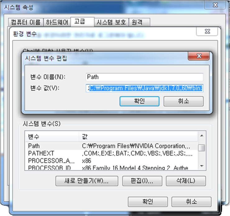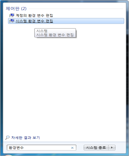 Windows 7: 시작 → 환경변수 입력 → 시스템환경 변수 편집 클릭