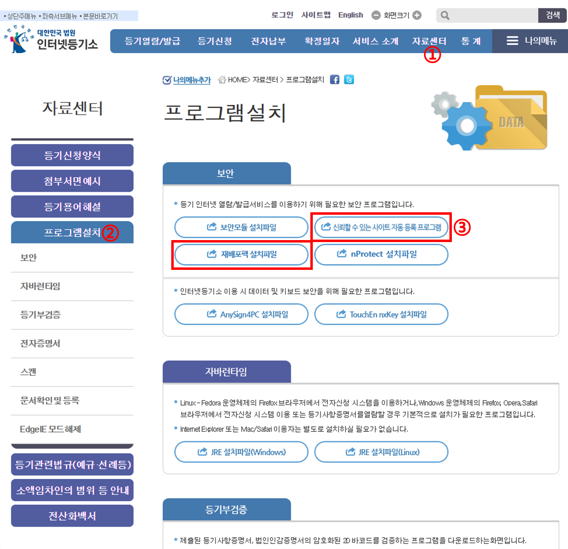 STEP 2. 이동: 상단메뉴 자료센터 > 좌측메뉴 프로그램설치