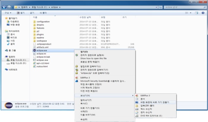 → 이클립스 폴더로 이동하여 이클립스를 바탕화면에서 실행 할 수 있도록 바탕화면에 바로가기 추가