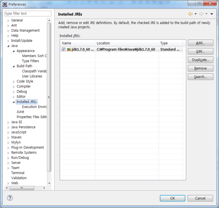 STEP 6. Preferences -> Java -> Installed JREs -> 아래와 같이 JDK가 정상적으로 설치되어 이클립스와 연동되는지 확인 -> 완료