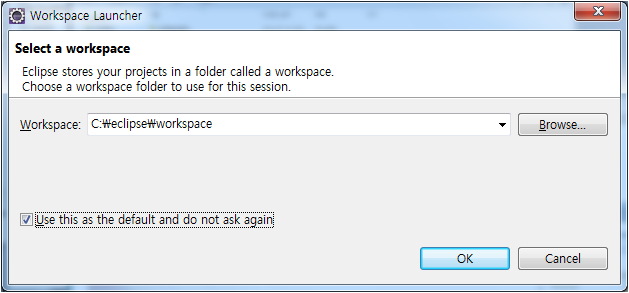 STEP 4. 이클립스를 실행 → Workspace Launcher창이 팝업된다면 Workspace 경로를 입력 (자신이 설치한 이클립스 폴더 내부에)