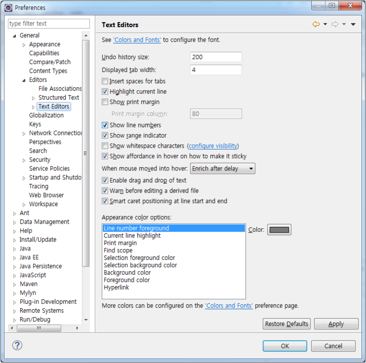 STEP 5. 상단 메뉴에서 Window를 클릭 -> Preferences 클릭 -> General -> Editors -> Text Editors -> 가운데 위치한 Show line numbers 체크 (코드 작성시 줄의 숫자를 표시)