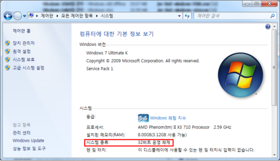 64비트일 경우 - 시스템 종류: 64비트 운영체제